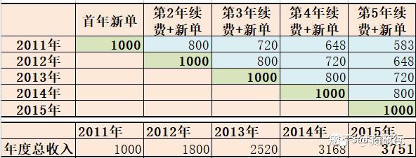 我簡單做一個SaaS的收入模型。假設一個SaaS公司每年新單收入1000萬,次年續費率80%,第3年起續費率90%(已經續過一次費的企業絕大部分會再續費)。