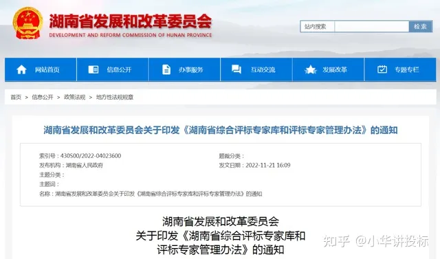 2022年11月21日,湖南省發展和改革委員會印發《湖南省綜合評標專家庫和評標專家管理辦法》(以下簡稱《管理辦法》),在專家評聘、履職考核、專家權利義務、專家抽取、處理和懲戒、責任追究等方面提出全面系統的要求。